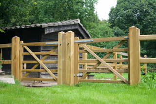 Voor de doorgangen zijn meerdere Engelse poorten geplaatst: drie enkele poorten van 1,50 meter breed en twee dubbele poorten van 2,10 meter breed.